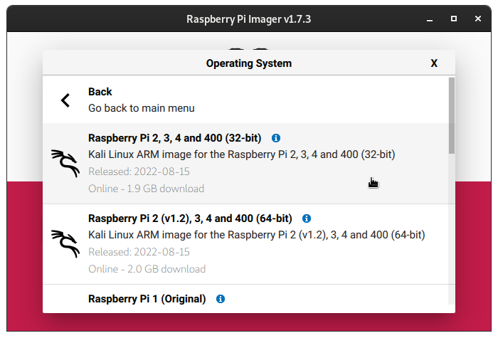 원하는 칼리 라즈베리 파이 이미지를 선택하면 애플리케이션 메인 화면으로 돌아갑니다: