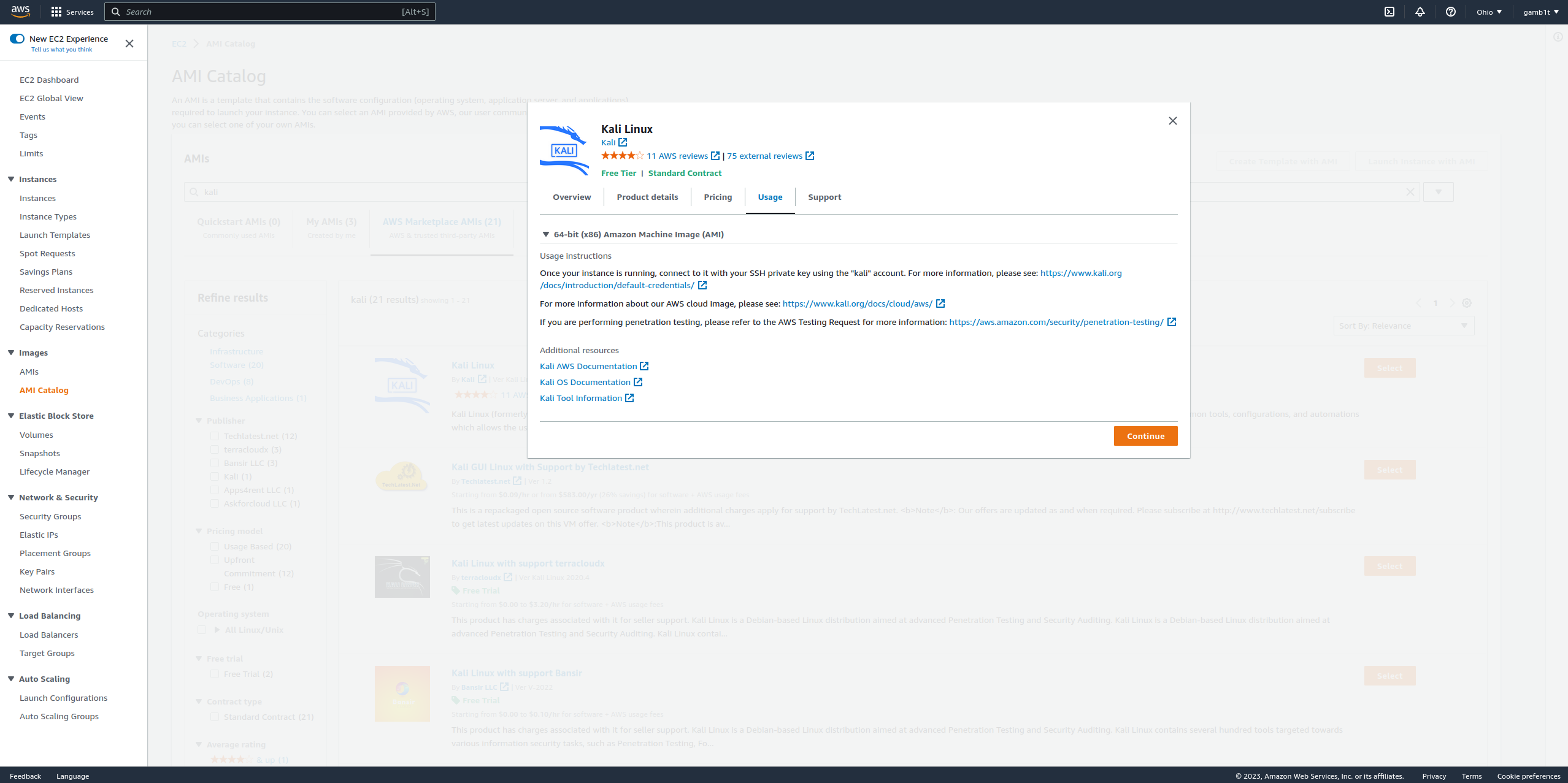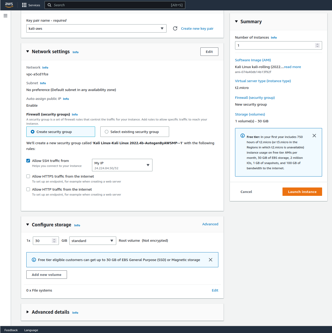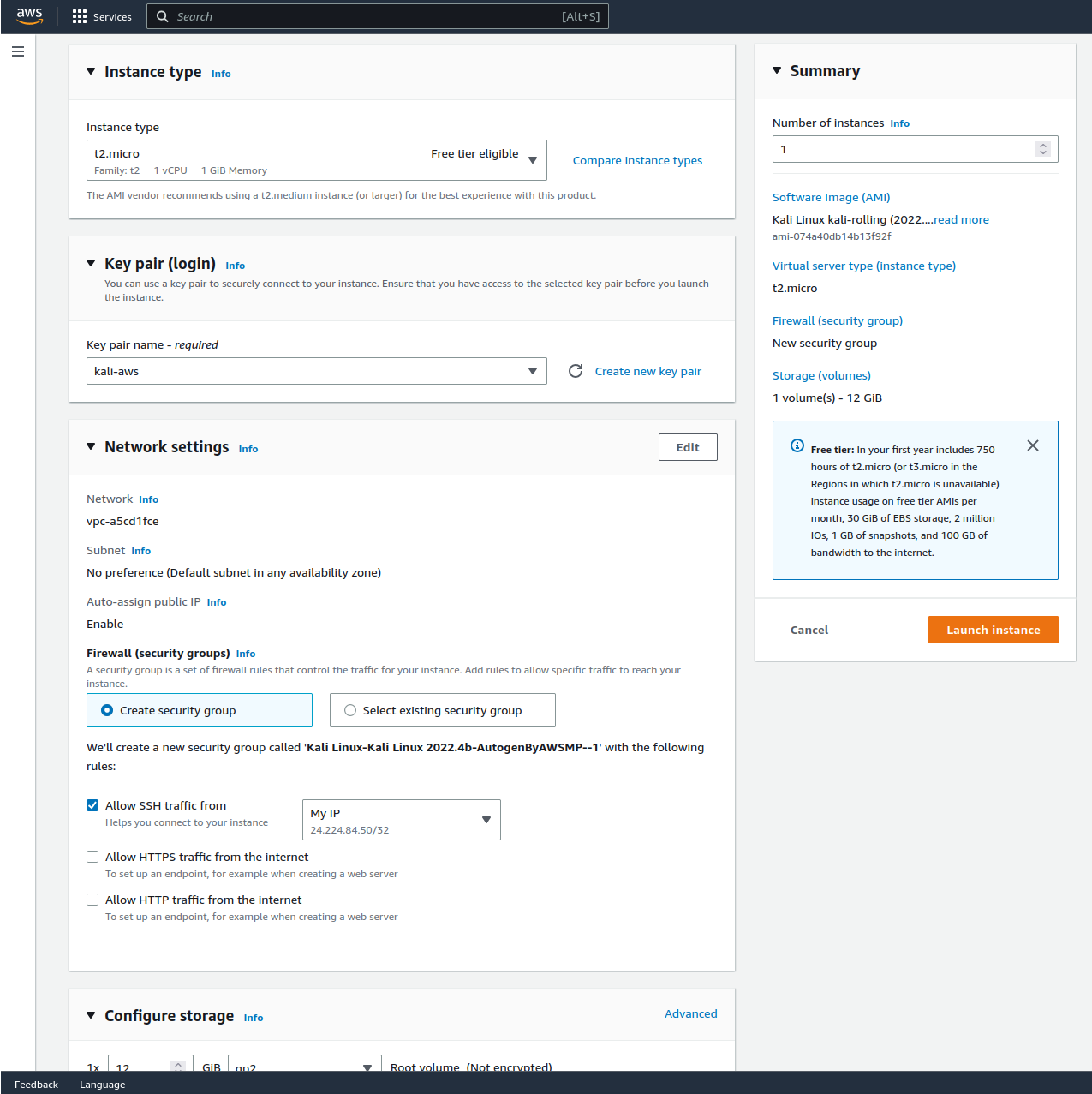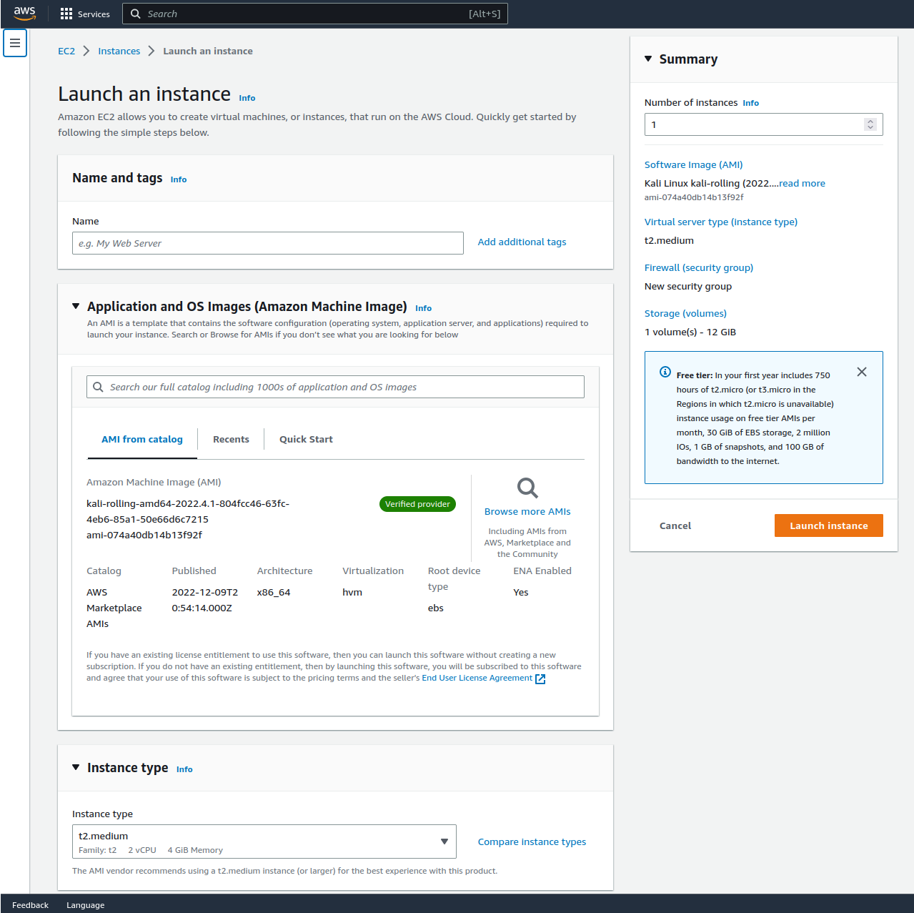 2023년 2월 기준으로 다음은 AWS 칼리 인스턴스를 설정하는 방법입니다. AWS 인터페이스는 지속적으로 업데이트되므로 미래에는 100% 정확하지 않을 수 있어요. 이런 경우가 발생하면 깃랩에 이슈를 제출하고 아마존의 튜토리얼을 참고해 주세요.