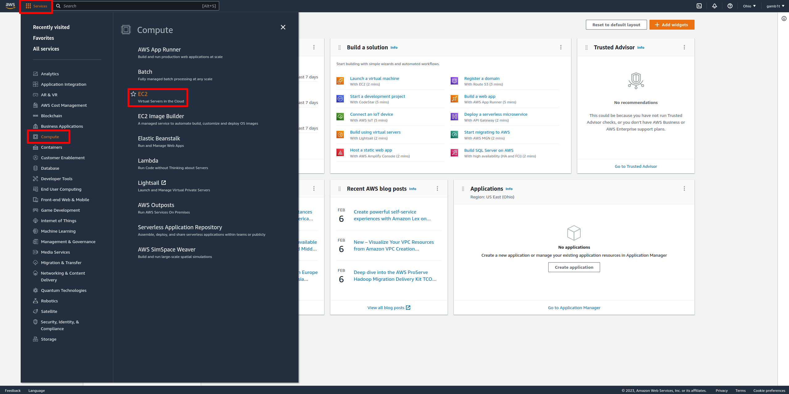 여기서 좌측 상단의 "서비스"를 클릭하고, "컴퓨팅"에 마우스를 올린 다음 아래와 같이 "EC2"를 클릭해주세요: