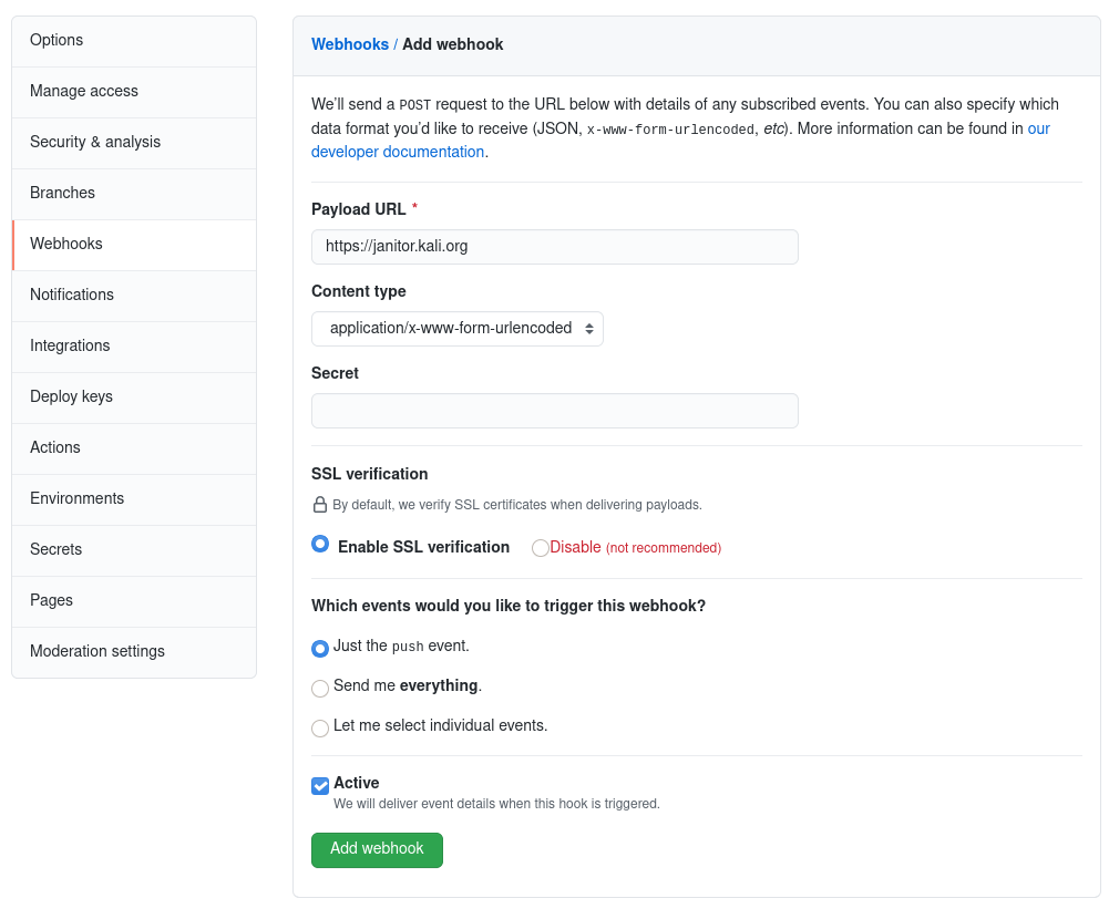 웹훅을 설정했는데 kali-bleeding-edge 저장소에서 업데이트된 패키지가 보이지 않는다면, 이 페이지의 나머지 부분을 읽어서 무엇이 잘못되었는지 알아볼 수 있어요. 막히면 언제든지 [email protected]로 연락해주시면 최선을 다해 해결해드릴게요.