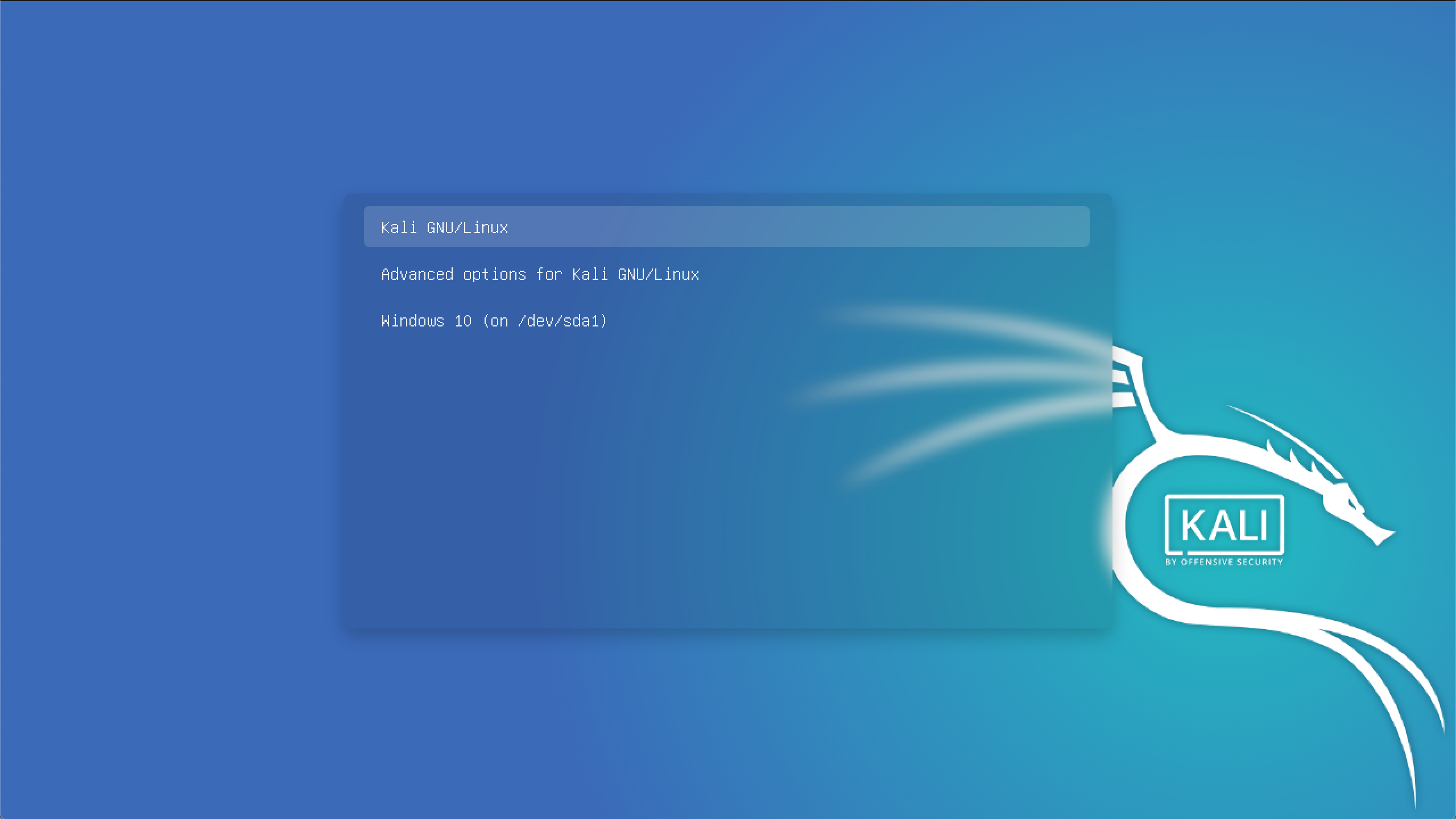 GRUB 부트 메뉴가 표시되면, 칼리 리눅스 또는 Windows로 부팅할 수 있어요.