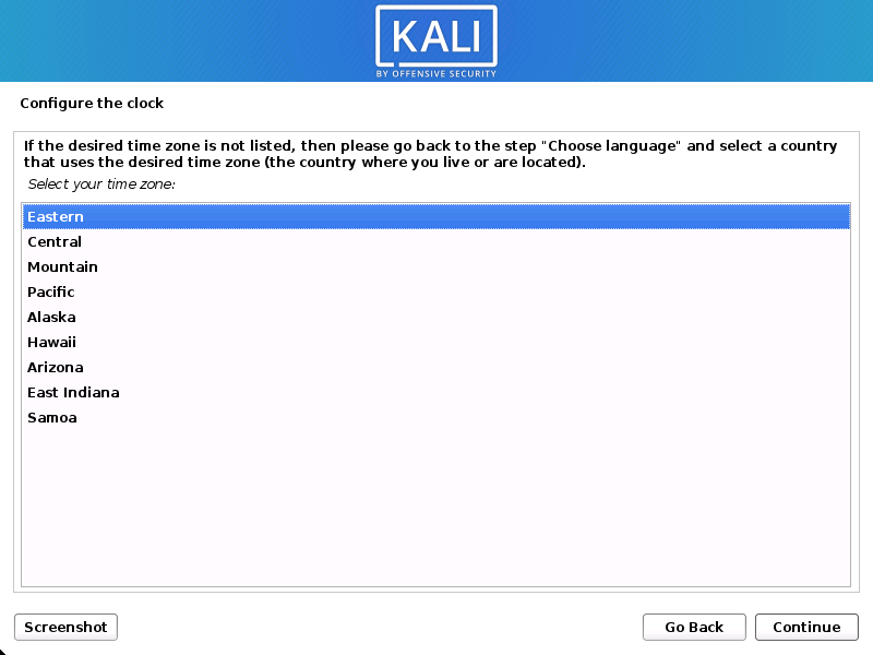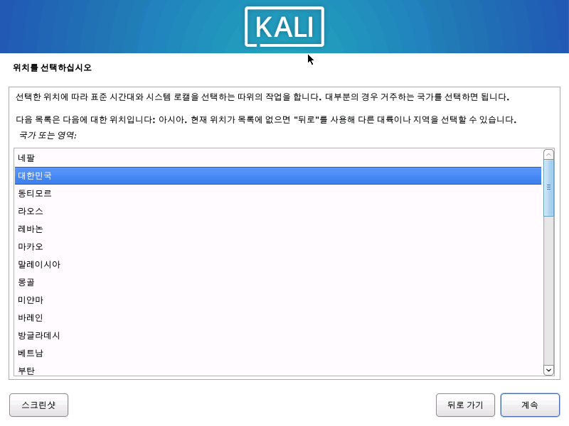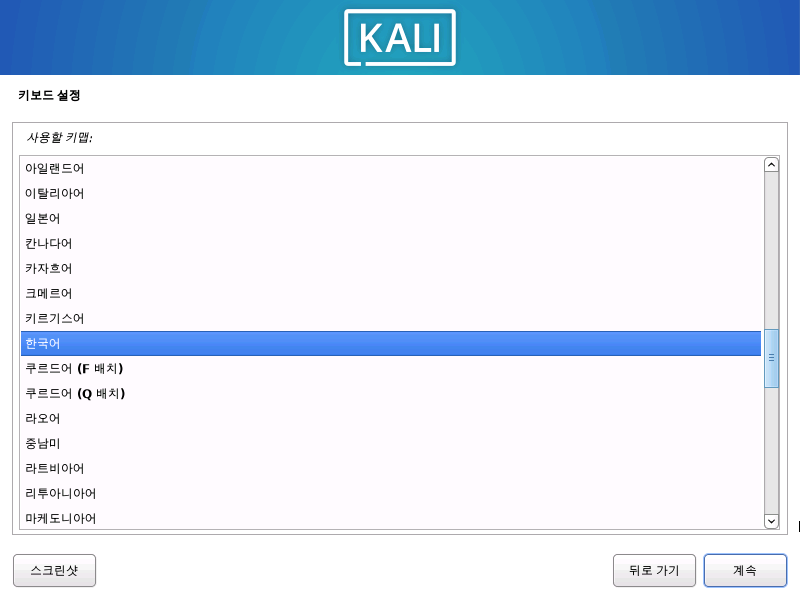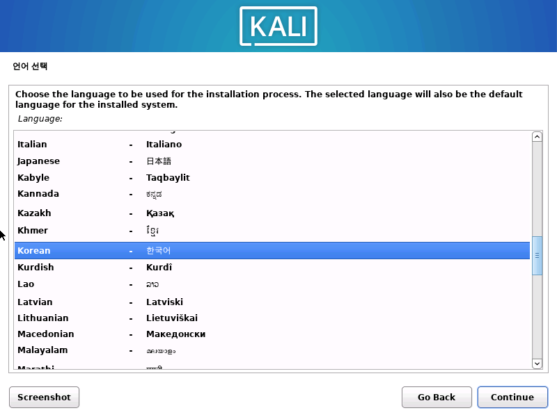 - 선호하는 언어를 선택하세요. 이는 설정 과정과 칼리 리눅스 사용 시 모두 사용될 거예요.