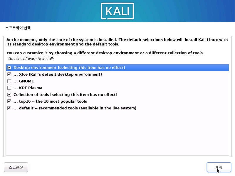 - 다음으로 설치할 메타패키지를 선택할 수 있어요. 기본 선택은 표준 칼리 리눅스 시스템을 설치하며 여기서 아무것도 변경할 필요가 없어요.
