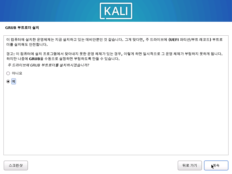 - 다음으로 GRUB 부트 로더 설치를 확인하세요.
