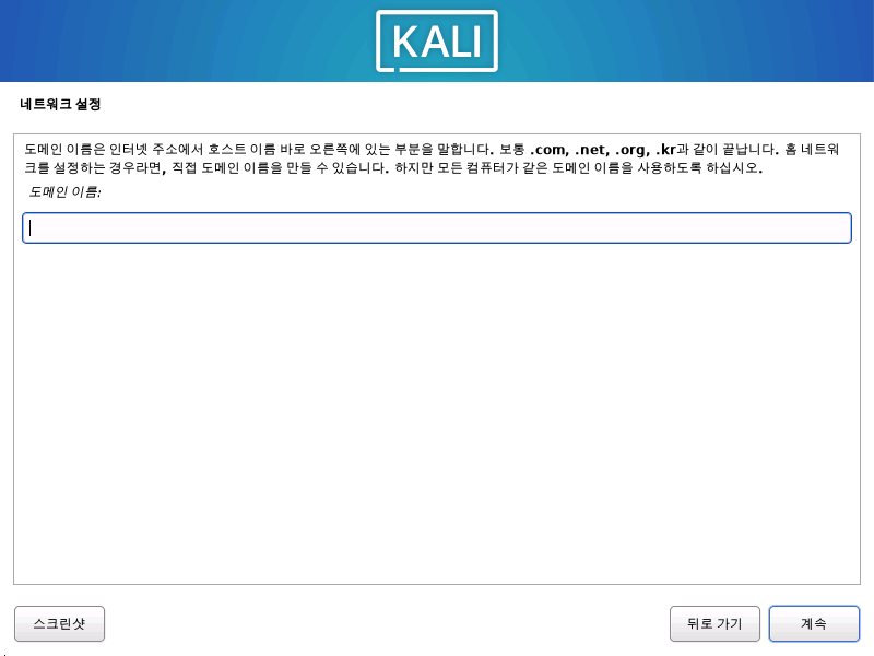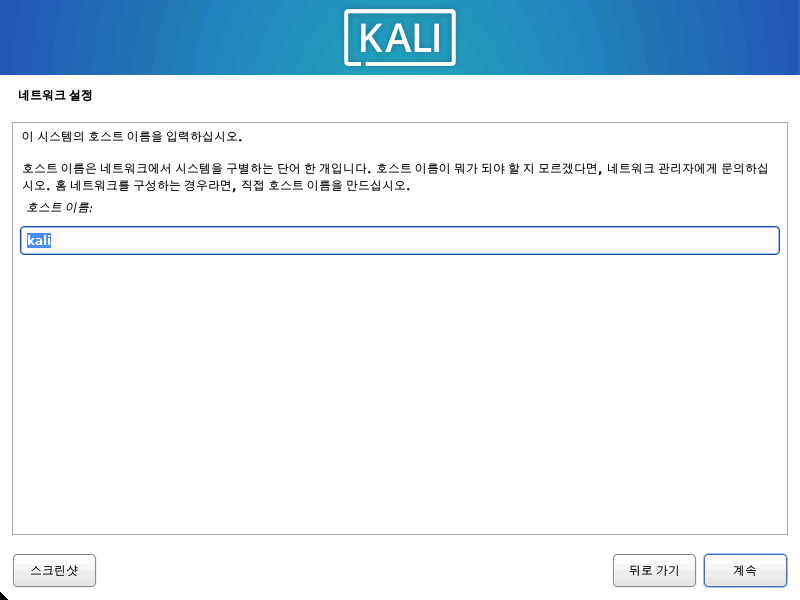 - 설정은 이제 네트워크 인터페이스를 검색하고 DHCP 서비스를 찾은 다음 시스템의 호스트 이름을 입력하라는 메시지를 표시해요. 아래 예시에서는 호스트 이름으로 kali를 입력했어요.
