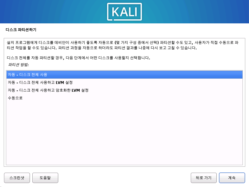 칼리 리눅스를 암호화하려면 자동 - 디스크 전체 사용하고 암호화한 LVM 설정을 선택하여 전체 디스크 암호화(FDE)를 활성화할 수 있어요. 이 옵션을 선택하면 설정 과정에서(이 가이드에 표시되지 않음) 암호를 입력하라는 메시지가 표시돼요(두 번). 칼리 리눅스를 시작할 때마다 이 암호를 입력해야 해요.