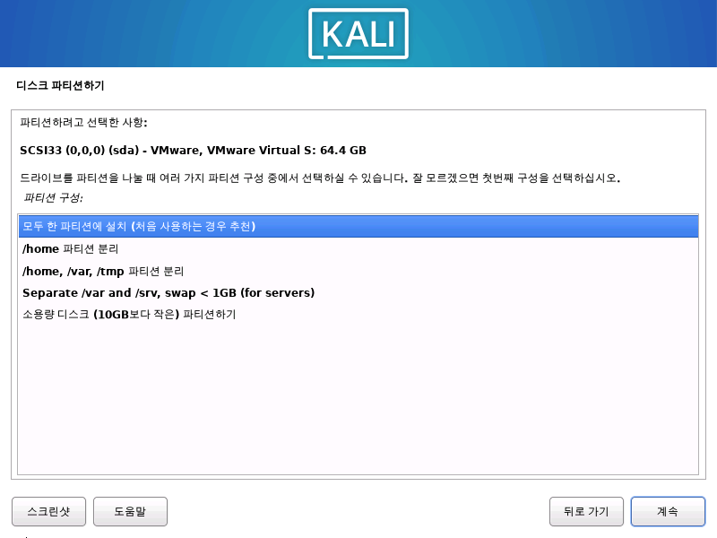 어떤 옵션을 선택할지 확실하지 않으면 "모두 한 파티션에 설치(처음 사용하는 경우 추천)"을 원할 거예요.