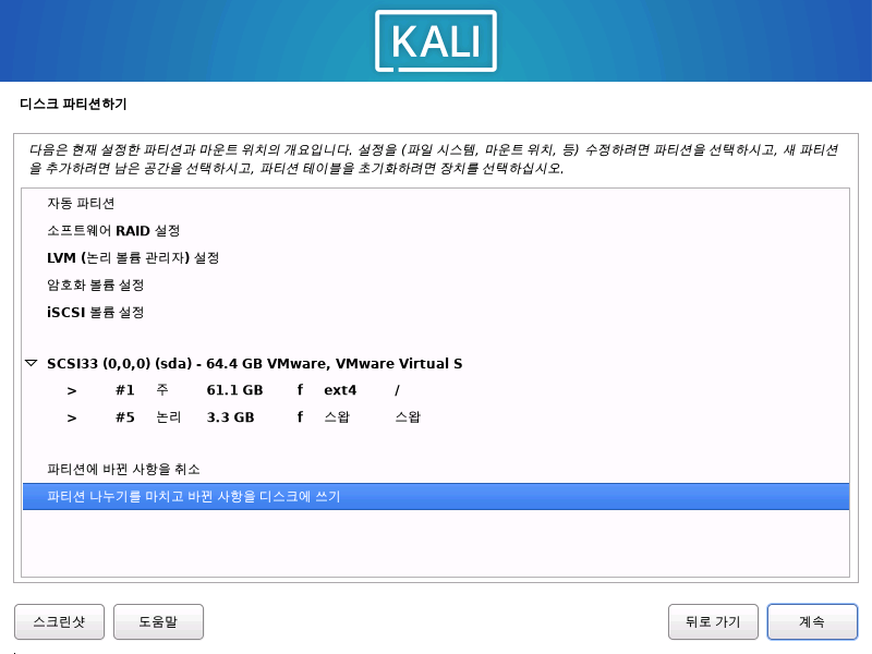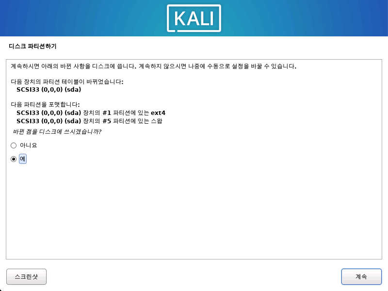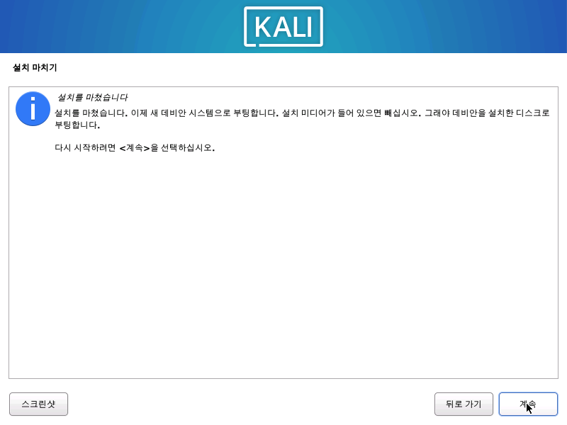 - 마지막으로 '계속'을 클릭하여 새로운 칼리 리눅스 설치로 재부팅하세요.