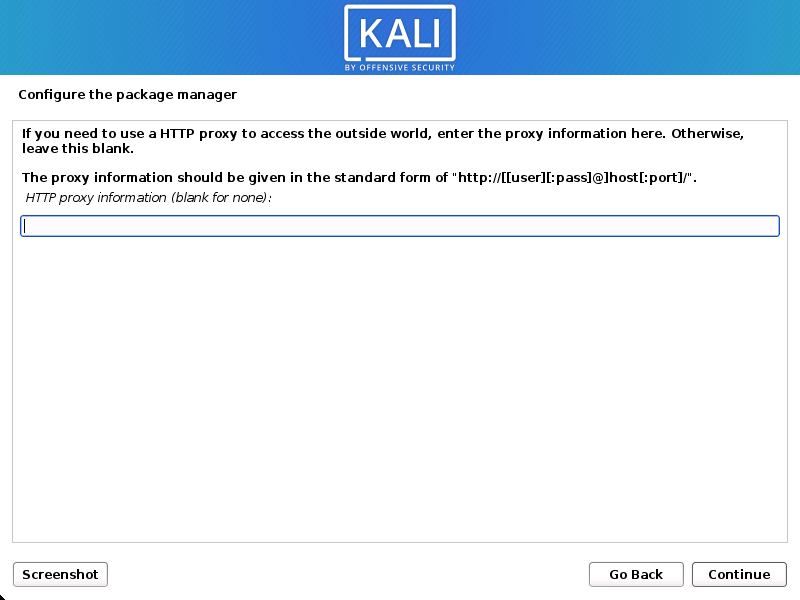 - 칼리 리눅스는 응용 프로그램을 배포하기 위해 중앙 저장소를 사용해요. 필요한 경우 적절한 프록시 정보를 입력해야 해요.