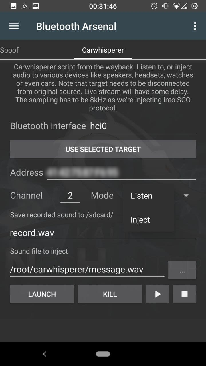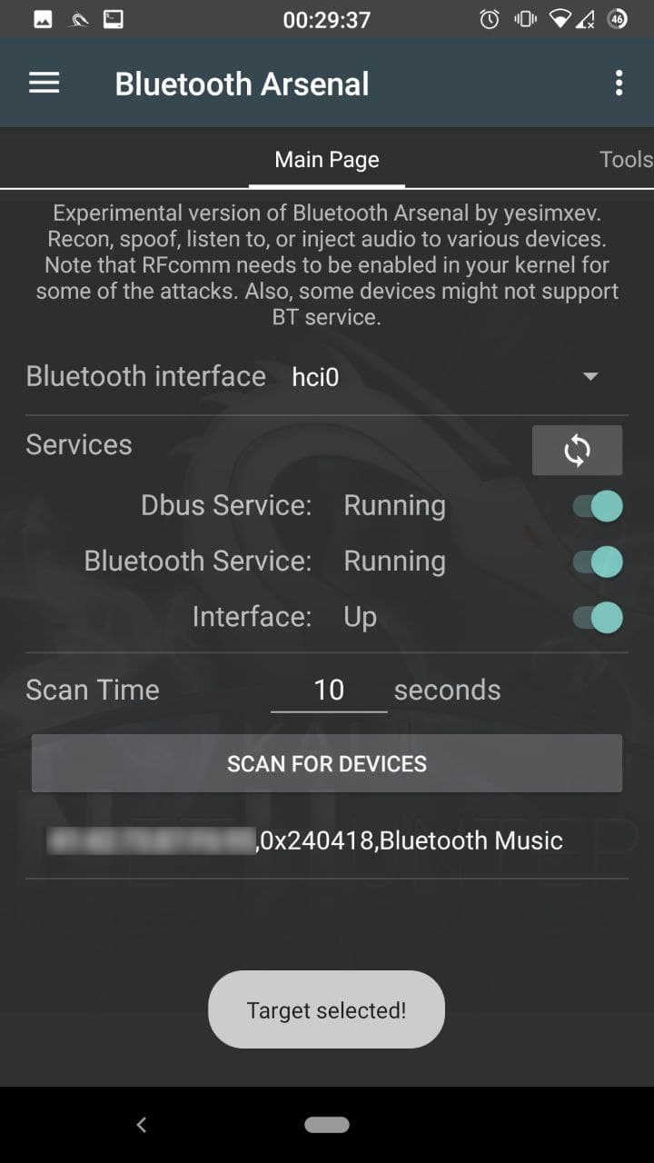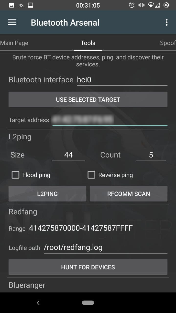 햄버거 메뉴 항목을 클릭하고 "Bluetooth Arsenal"을 선택하여 블루투스 메뉴를 열어요. 여기서 서비스를 시작하고 중지하고, 인터페이스를 활성화하고, 검색 가능한 기기를 스캔할 수 있어요. 다음 페이지의 Redfang을 사용하면 검색 모드가 아닌 기기도 찾을 수 있어요. BLE(Bluetooth Low Energy, 저전력 블루투스)는 아직 지원되지 않아요.