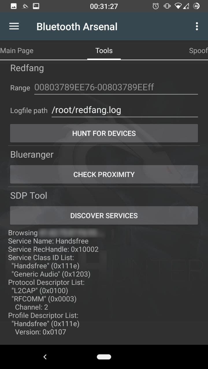 대상의 서비스를 살펴보고 열린 서비스를 찾아요. 핸즈프리 서비스는 우리가 공격할 수 있는 취약한 오디오 서비스예요. "DISCOVER SERVICES"를 탭하여 시작해요.