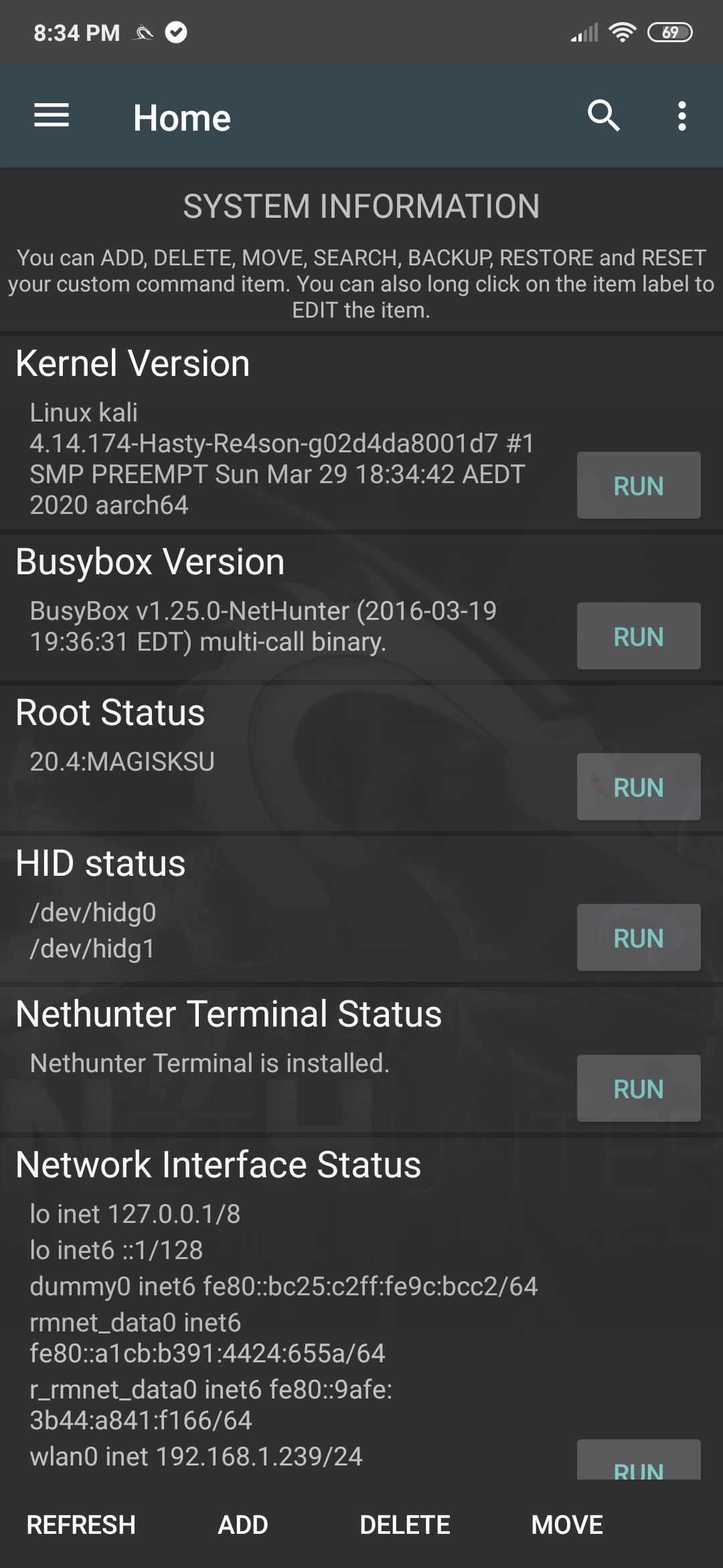넷헌터 홈 화면은 기기에 대한 유용하고 자주 사용되는 정보를 볼 수 있는 공통 공간을 제공해요. 여기에는 외부 및 내부 IP 주소와 HID 인터페이스의 사용 가능 여부가 포함돼요.