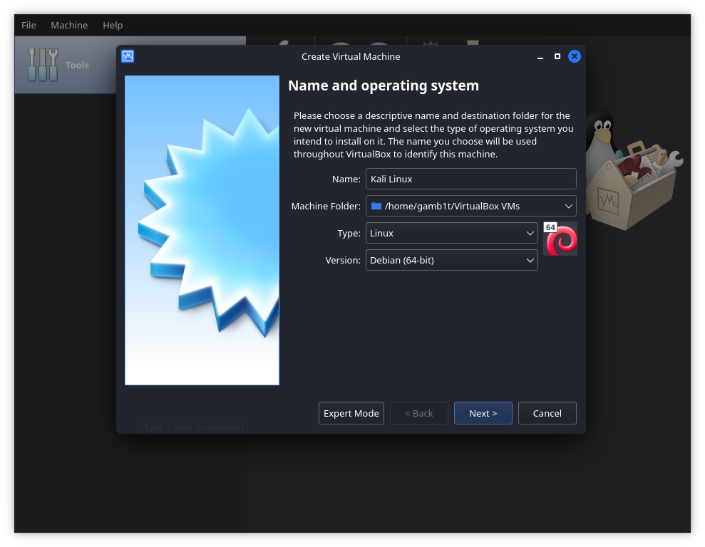 여기서 새 가상머신(VM)을 만들 거예요. 원하는 이름을 지정하고 유형으로 'Linux'를, 버전으로 'Debian (64-bit)'을 선택해요.