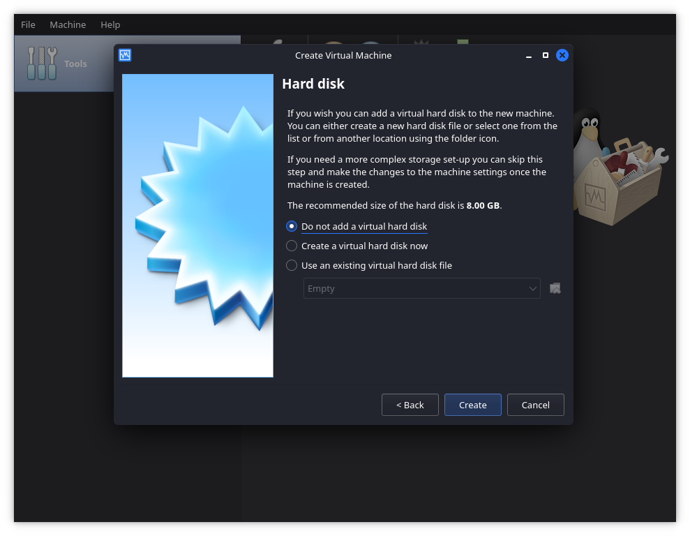 가상 하드 디스크를 생성하지 않도록 주의해야 해요. 확인을 요청할 텐데, 확인하고 계속해요.
