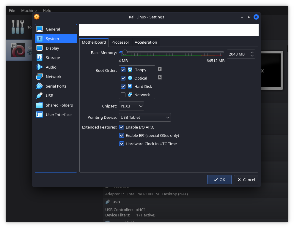 이제 설정을 편집할 수 있어요. '시스템'의 '마더보드'에서 EFI를 활성화할 거예요.