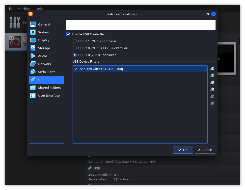 이제 'USB'로 이동해서 초록색 플러스가 있는 USB 아이콘을 선택해요. Kali Live USB 드라이브를 추가하고 USB 3.0으로 설정되어 있는지 확인해요.