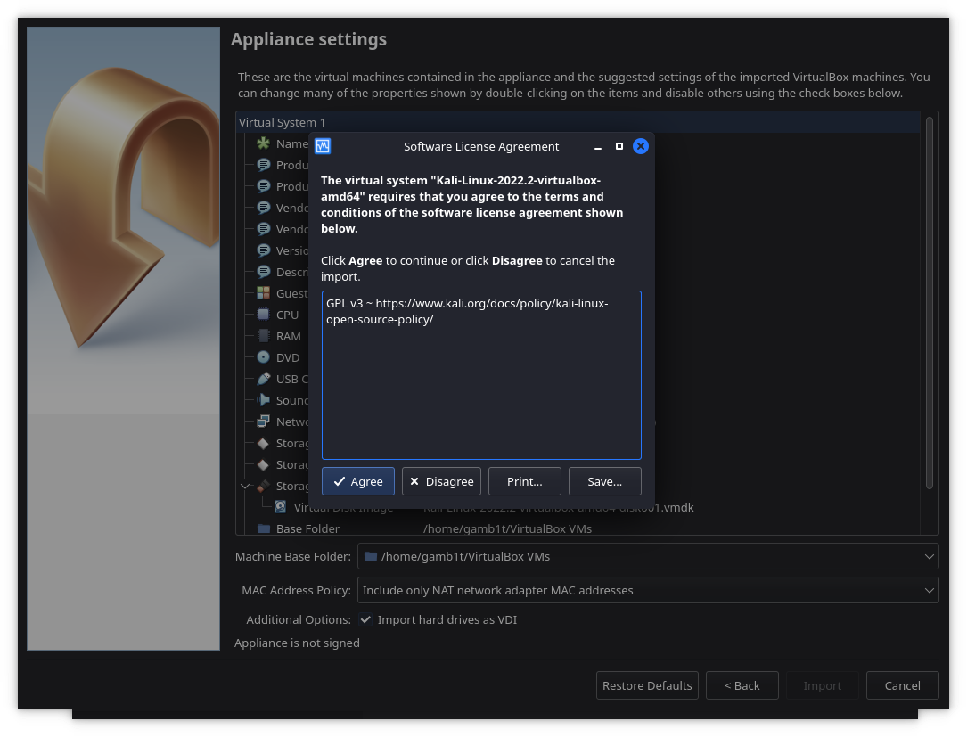 이제 라이선스 계약에 동의하기만 하면 모든 과정이 끝나요. 여기서 VM을 부팅하고 평소처럼 사용할 수 있어요. 기본 로그인 사용자 이름과 비밀번호는 모두 kali라는 점을 기억하세요!