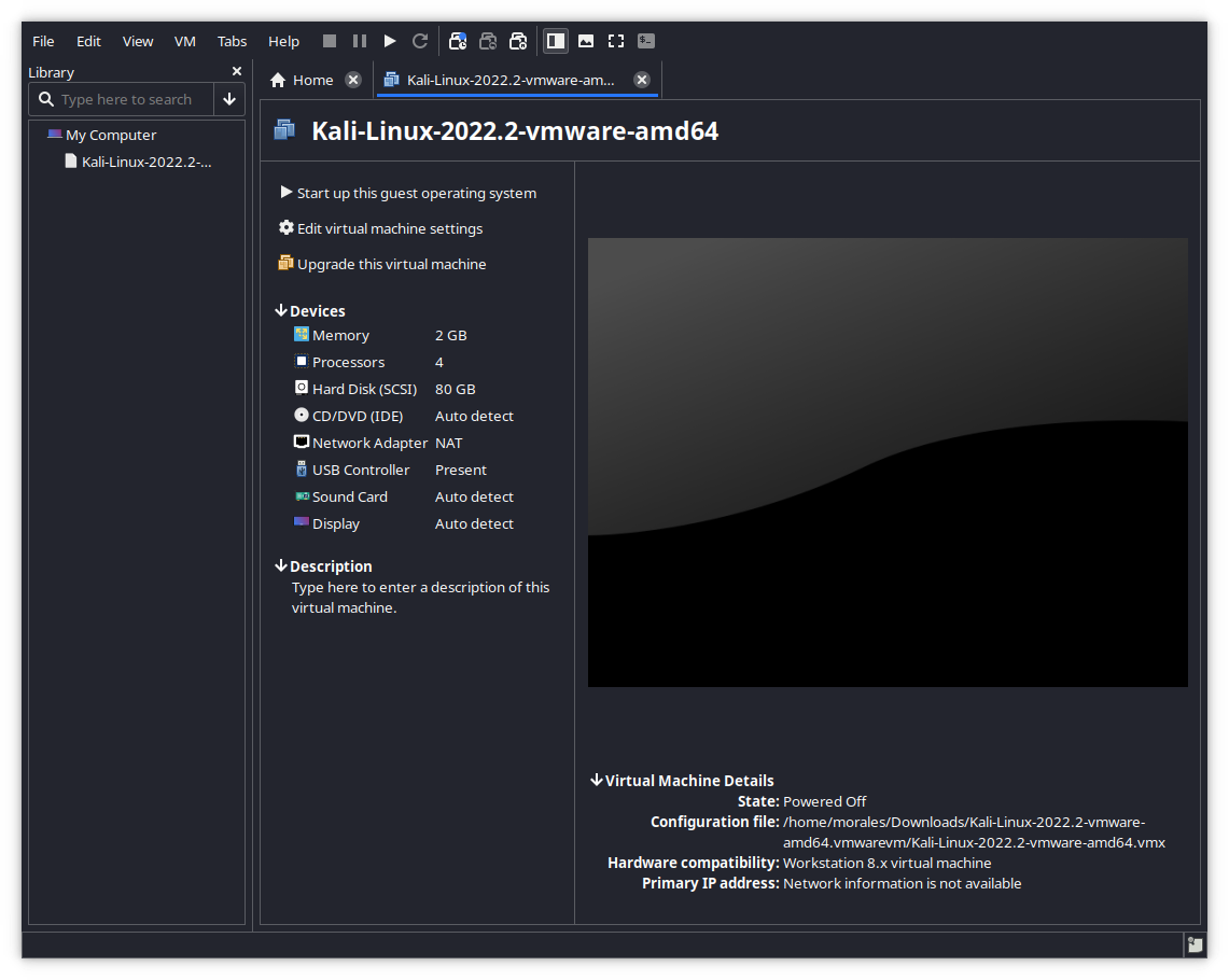 여기서 설정될 내용을 확인할 수 있으며, 필요한 경우 변경할 수도 있어요. 모든 설정이 마음에 들면 VM을 부팅하고 평소처럼 사용할 수 있어요. 기본 로그인 사용자 이름과 비밀번호는 모두 kali라는 점을 기억하세요!