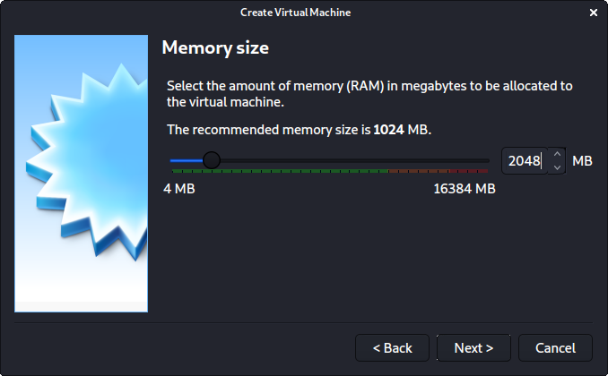 "메모리 크기"는 RAM을 얼마나 사용할지 정의할 수 있는 다음 섹션이에요. 다시 말하지만, RAM의 양이 높을수록 더 많은 애플리케이션을 열 수 있고 성능이 향상돼요. 칼리 내부의 다양한 도구들은 리소스를 많이 요구할 수 있어요. 일반 가상머신을 만들 때는 RAM으로 2048 MB (2GB)를 선택하지만, 칼리가 활용할 수 있는 여분의 RAM이 있는 고성능 장치를 가지고 있으므로 개인 머신에서는 종종 이를 늘려요.