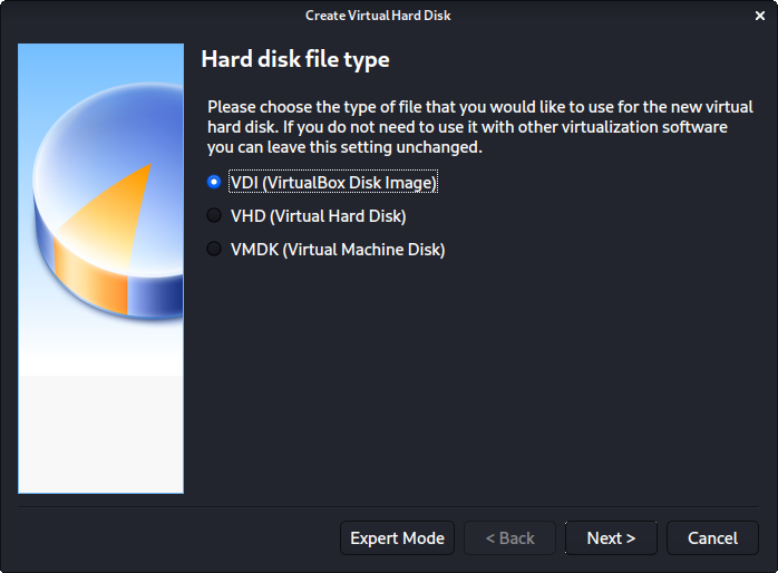 "하드 디스크 파일 형식"의 경우 VDI (VirtualBox 디스크 이미지)를 선택해요(그리고 이것이 기본 옵션이에요).