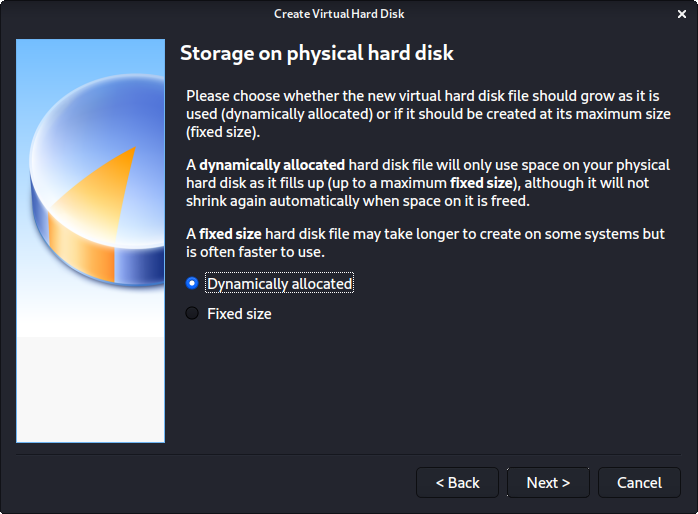 다음 화면인 "물리적 하드 디스크의 저장소"에서는 기본 옵션인 동적 할당을 선택해요.
