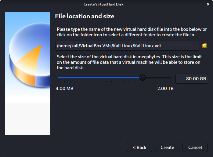 이제 "파일 위치 및 크기"에서 가상 하드 디스크가 얼마나 클지 정의할 수 있어요. 가상머신에는 80.00 GB를 사용해요.