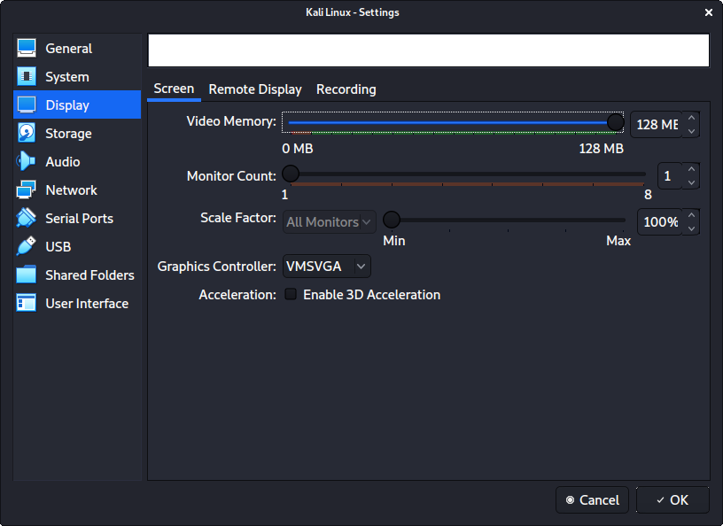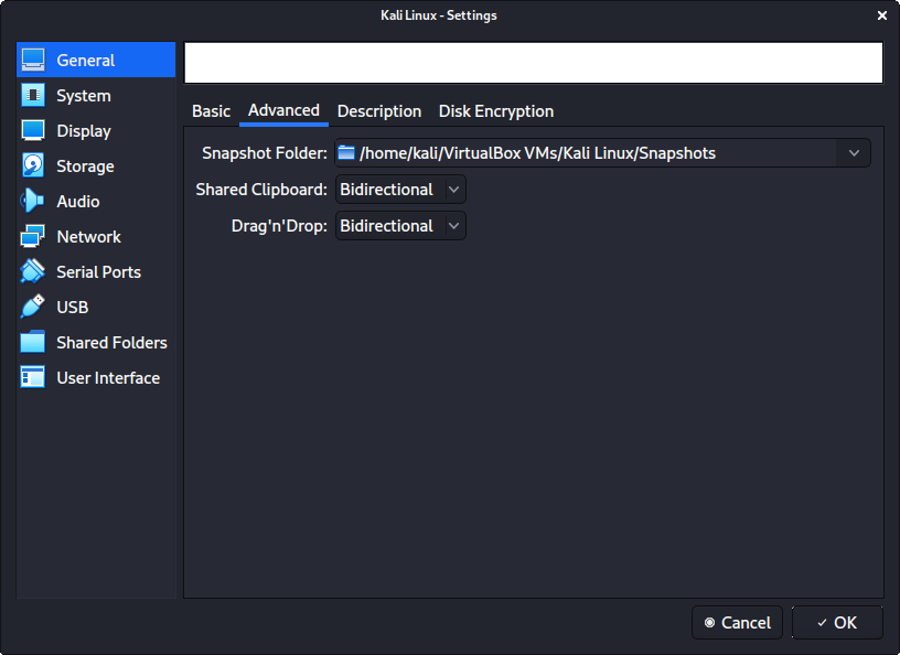 칼리 리눅스 설정 과정에서 설치 마법사가상머신 내부에 있는지 감지해야 해요. 그렇다면 더 나은 사용자 경험을 제공하기 위해 추가 도구들을 자동으로 설치해야 해요(virtualbox-guest-x11 같은). 수동으로 다시 설치하고 싶다면 VirtualBox 게스트 가이드를 참조할 수 있어요.
