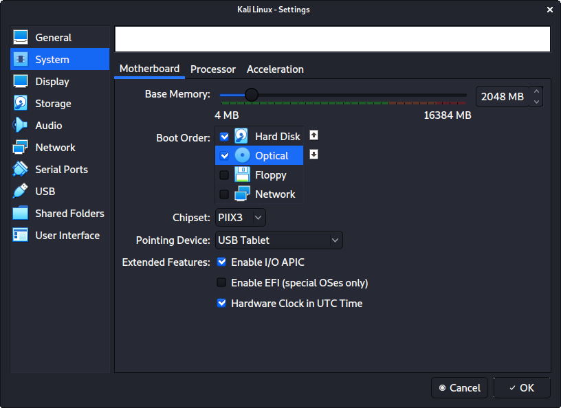 "시스템" -> "마더보드"에서 "부팅 순서"를 변경하여 하드 디스크가 맨 위에 있고 광학이 두 번째가 되도록 해요. 나머지는 모두 비활성화돼요.