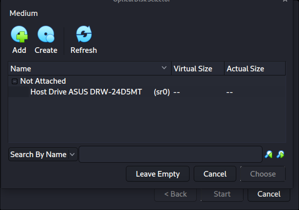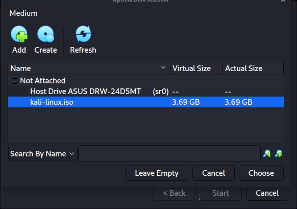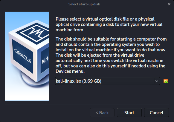 처음 실행할 때 "시작 디스크"로 사용할 이미지를 마운트하고 싶은지 묻는 프롬프트가 나타날 거예요. 물리적 드라이브보다는 칼리 이미지를 사용하고 싶으므로 드롭다운 옆의 아이콘을 선택해요.