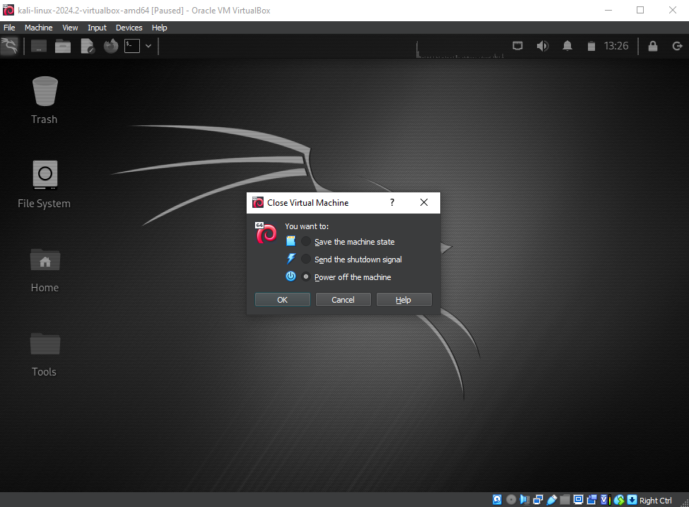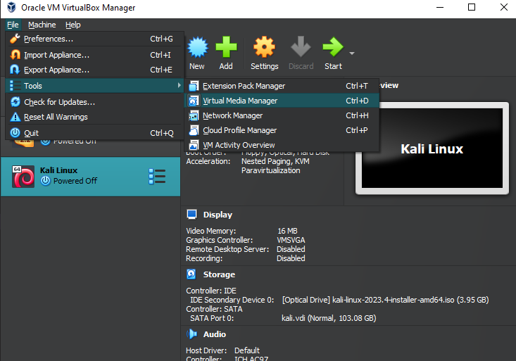 칼리 리눅스 가상 머신이 종료되어 있는지 확인하세요.