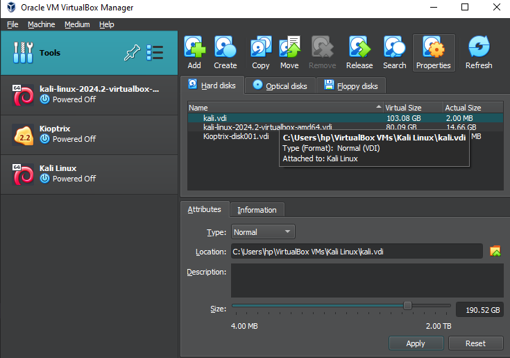 이 가이드에서는 일반적으로 유지하고 있어요(칼리는 롤링 배포판이고 우리가 업데이트하기 때문에). 하지만 우리 릴리스의 경우 고정 릴리스이므로 이름에 버전 번호를 사용해요 (kali-linux-YYYY.N-vbox-ARCH. 예시: kali-linux-2025.4-vbox-amd64).