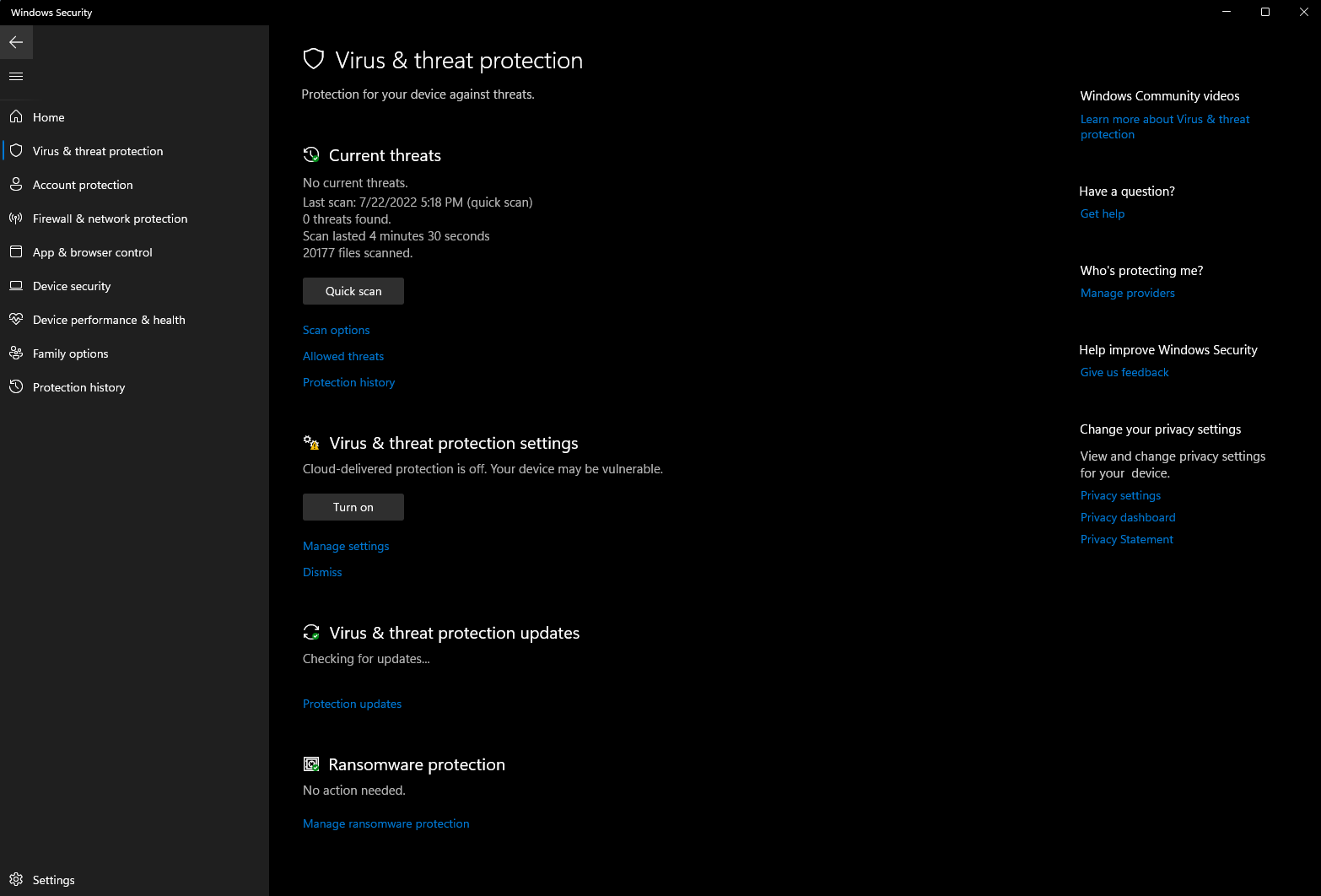 - "시작" > "설정" > "업데이트 및 보안" > "Windows 보안" > "바이러스 및 위협 방지"를 선택하세요.