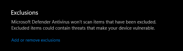 - "바이러스 및 위협 방지 설정" 아래에서 "설정 관리"를 선택하고, "예외" 아래에서 "예외 추가 또는 제거"를 선택하세요.