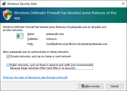 • 처음으로 사운드 지원으로 Win-KeX를 시작할 때, 윈도우 디펜더 방화벽을 통한 트래픽 허용 권한을 요청받으면 공용 네트워크를 선택해야 해요.